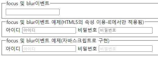 <legend>focus 및 blur이벤트 예제(자바스크립트로 구현)</legend>