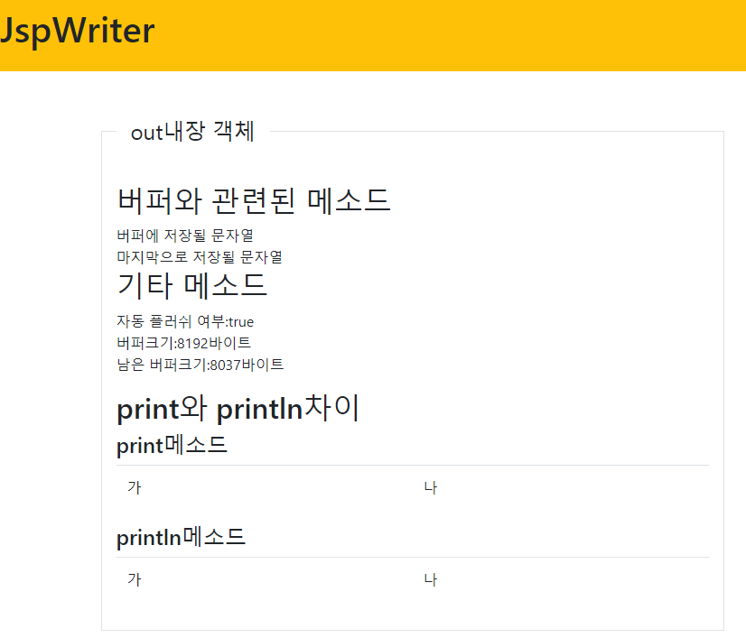 - JSP 페이지가 웹브라우저에 보내는 모든 정보는 out 객체를 통해 전달이 된다.