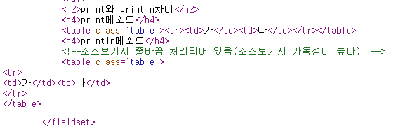 ▲ 그냥 보기에는 print와 println차이가 보이지 않는다. 페이지 소스보기를 하면 차이가 있다.