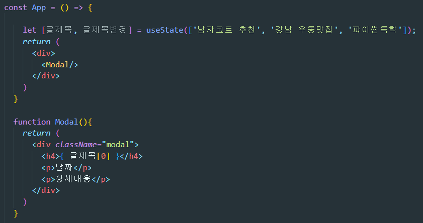 왜냐면 글제목이라는 state 변수는 function App()에 있지 function Modal()에 없으니까요.