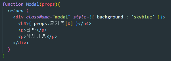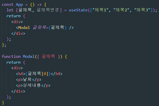 <Modal 글제목={변수명}> 일반 변수, 함수 전송도 가능하고