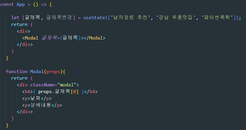 글제목이라는 부모 컴포넌트의 state를 자식 컴포넌트 <Modal>에 전송해봅시다.