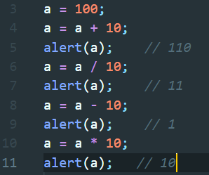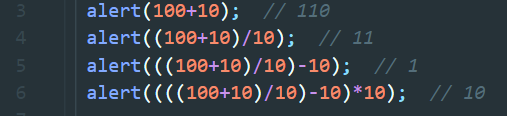 예를들어 100에 10을 더하고, 10을 나눈 후에 다시 10을 빼고 거기에 10을 곱해야 한다고 하자. 그리고 각 단계마다 결과를 출력해야 한다면 코드는 아래와 같을 것이다.