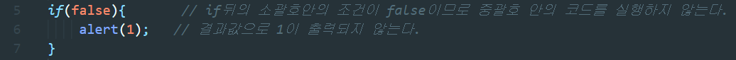 ▲ if뒤 소괄호 안의 조건 값이 false이므로 중괄호안의 코드 실행시키지 않고 조건문 종료. 이후 alert(5);만 실행시킨다.