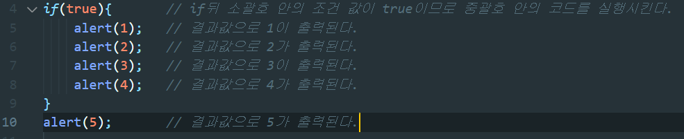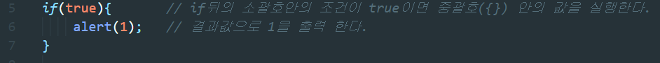 ▲ if뒤 소괄호 안의 조건의 값이 true 이므로 중괄호안의 코드를 실행시킨다. 조건문 종료 후 alert(5); 또한 실행시킨다.