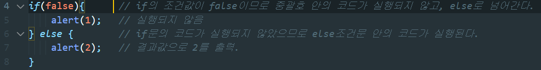 ▲ if 조건값이 false이므로 중괄호 안의 코드실행되지 않고, 다음 조건인 else의 코드를 실행한다. 이후 조건문 종료.