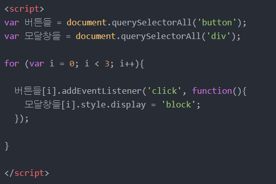 근데 내부 코드는 addEventListener 어쩌구 입니다. 클릭 되면 콜백함수 내의 모달창들[i].style.display = 'block'; 을 실행해주세요~ 라는 코드입니다.
