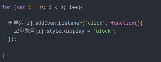 반복문을 해석한 후.. 누군가 버튼을 클릭하면 addEventListener 내의 모달창들[i].style.display = 'block'; 코드가 발동됩니다.
