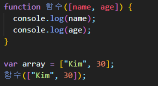 파라미터인 [name, age] 를 만들 때 ['Kim', 30] 이걸 그대로 대입해서 만드는 것이죠.