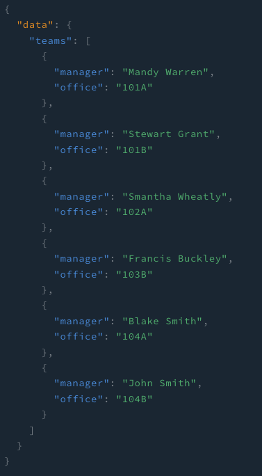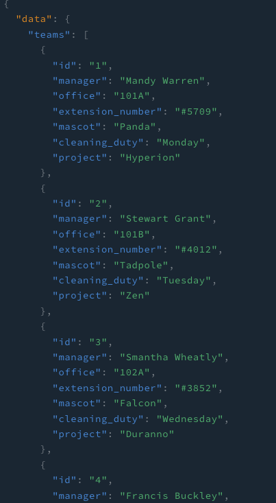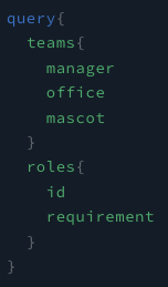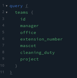 위와 같이 query 로 시작하면 아! 정보를 얻으려고 하는거구나! 라고 서버는 인식하는 것이다. 이후 { } 안에 가져오고 싶은 데이터를 넣어주면 되는데 저는 모든 team에서 위와 같은 정보를 얻어올 것이다. 위와 같이 작성하고 요청을 날리면