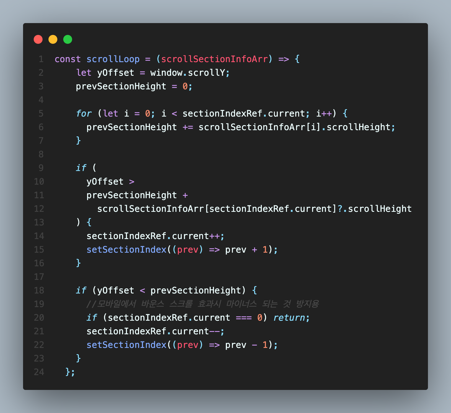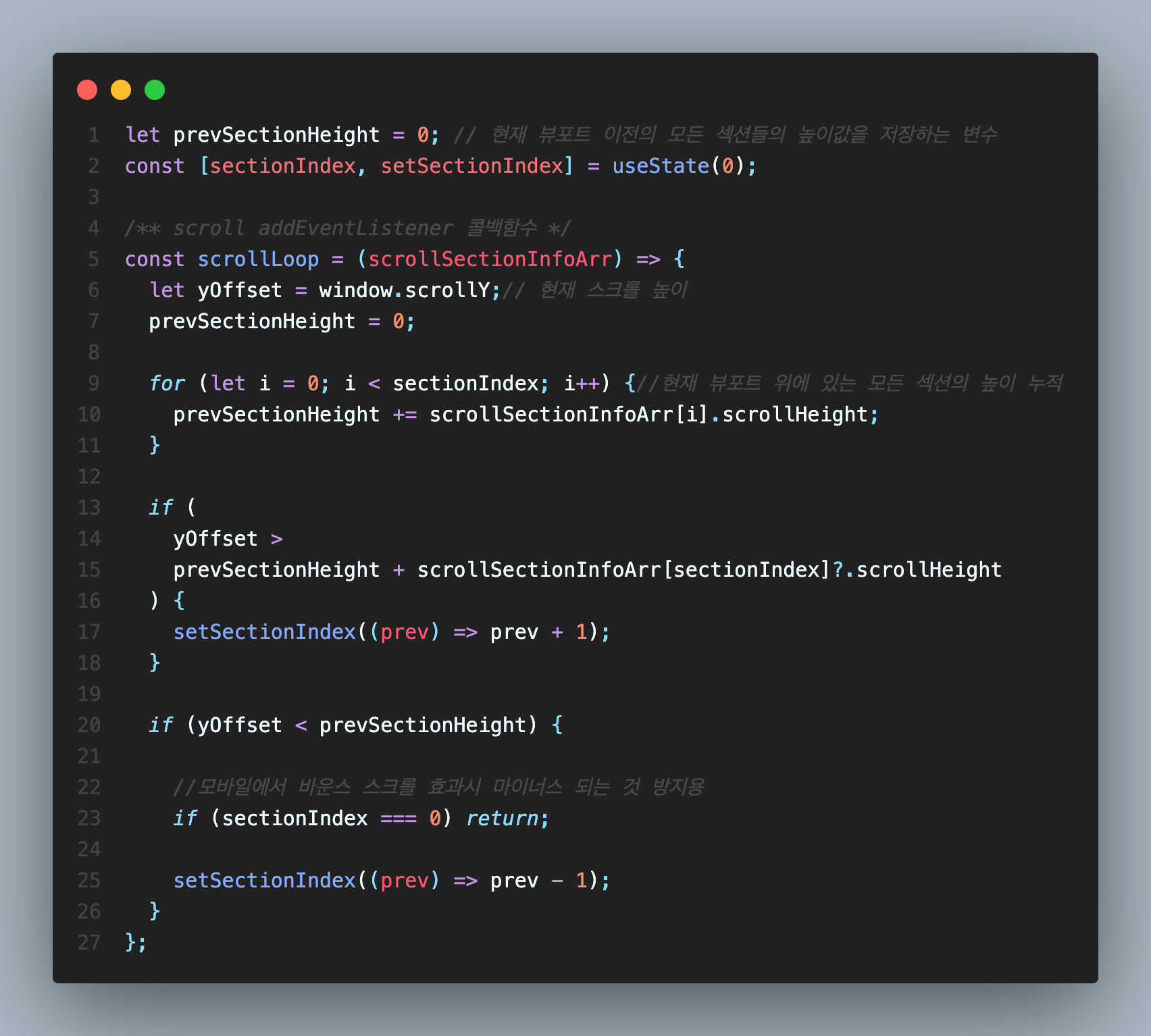⛔️ sectionIndex가 변화하지 않으면 scrollLoop안의 로직은 무의미하기 때문에 로직을 작동시킬 수 있는 변화하는 section Index값이 필요했다.