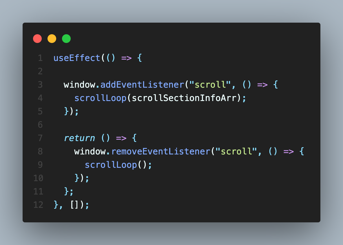 즉, useEffect 실행시점에 scrollLoop는 sectionIndex가 0인 렉시컬 환경을 기억하고 있는 것이다. 이후에 sectionIndex가 업데이트가 되어 새로운 함수가 생성되더라도 useEffect에서 기억하는 함수는 sectionIndex가 0인 함수를 실행하기 때문이다.