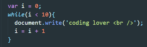 그 다음에는 '반복조건'인 i<10이 실행된다. 현재 i의 값은 0이다. 때문에 이 조건은 참이다. 반복조건이 참이면 중괄호 안의 내용이 실행된다. i의 값이 0이기 때문에 'coding lover<br />'이라는 텍스트가 출력된다. 이후 1++가 실행되는데 현재 i의 값에 1을 더하는 의미이다. 현재 i의 값은 0이기 때문에 i++의 결과로 i는 1이 된다.