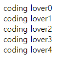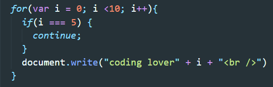 ▲ break를 continue로만 바꿨을 뿐인데 결과의 차이는 크다. i === 5 일 때만 실행이 중단되고 나머지는 반복문은 실행되어서 결과적으로 'coding lover5' 만 출력되지 않았을뿐 나머지는 출력되었다.