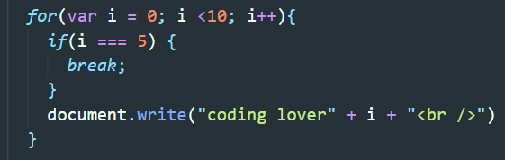 이후 반복이 실행되면서 변수 i 가 1씩 증가하다 5가 되었을 때, for문 안에 있는 if문의 조건과 일치하게 되고 if의 조건이 true가 되면서 if문안의 코드가 실행된다. 반복문 안의 break가 실행되면 반복문을 즉시 종료시키게 된다.
