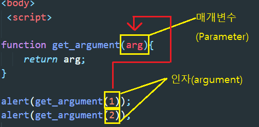 4) get_argument(1) => arg => 1 => 최종적으로 alert(1);이 되어 출력값을 1이 출력된다.( 2의 경우도 동일한 방법)