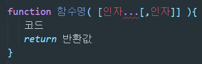 function 뒤에는 자신이 이 함수를 뭐라고 정의할 것인지 함수의 이름을 지어주면 된다. 그리고는 소괄호가 나오고 중괄호가 나오는 순서이고 인자는 아래에서 자세히 설명하도록 하고 중괄호 안에는 이 함수를 사용하였을 때 출력되게 하고 싶은 코드를 적어주면 된다. return은 예시이며 꼭 return을 사용해야 하는 것은 아니다.