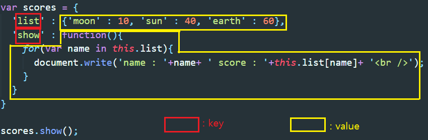 ▲ scores라는 객체안에 list라는 key값과 list의 value 값으로 또 다른 객체를 넣었고, show라는 key값과 show의 value값으로 함수를 넣었다.