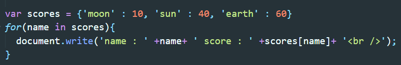 ▲ scores라는 객체를 생성 후 반복문인 for문을 사용하여 객체 않은 내용을 출력하는 것이다. key in scores는 scores에서 차례대로 key값을 가져와서 변수 name에 대입하고 중괄호 안의 코드를 실행하라는 내용이다. 반복문이 실행될 때 변수 name의 값으로 moon, sun, earth가 순차적으로 할당되기 때문에 scores[name]을 통해서 객체의 value값을 알아낼 수 있다.