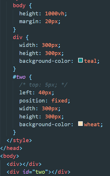 만약 여기서 postion : fixed가 되어있는 div에 top,left,right,bottom중 하나의 값만 줘도 서로 다른 layer에 놓이게 된다.