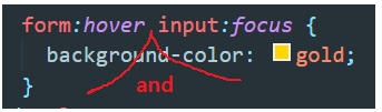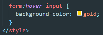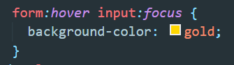 ▲ form에 마우스커서를 hover시킨 상태에서 input이 focus상태일 때 background-color가 gold가 되는 코드이다.