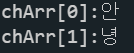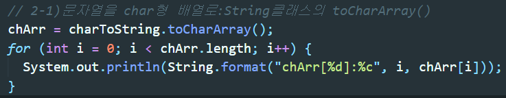 ▲ 문자열을 char[]로 변환하는 방법은 우리가 wrapper클래스 포스팅에서 사용했던 메소드와 동일하게 toCharArry()를 사용하면 된다.