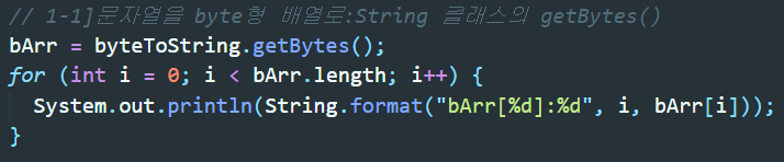 ▲ String에서 byte형 배열로 바꿀 때는 wrapper클래스 포스팅때도 쓴 getByte()메소드를 사용하면 된다.